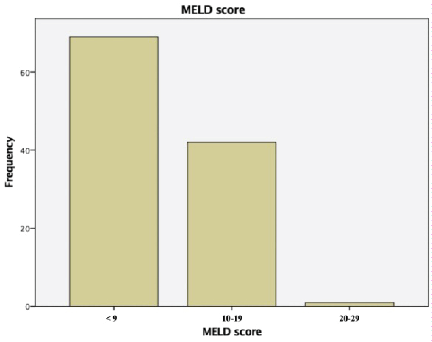 A total of 112 patients with MRI Liver performed were included in the study. The total number of patients with MELD score of 9 or below were 69 patients, 10 to 19 were 42 patients and 20 to 29 was 1 patient. The distribution is as shown in Figure 2.