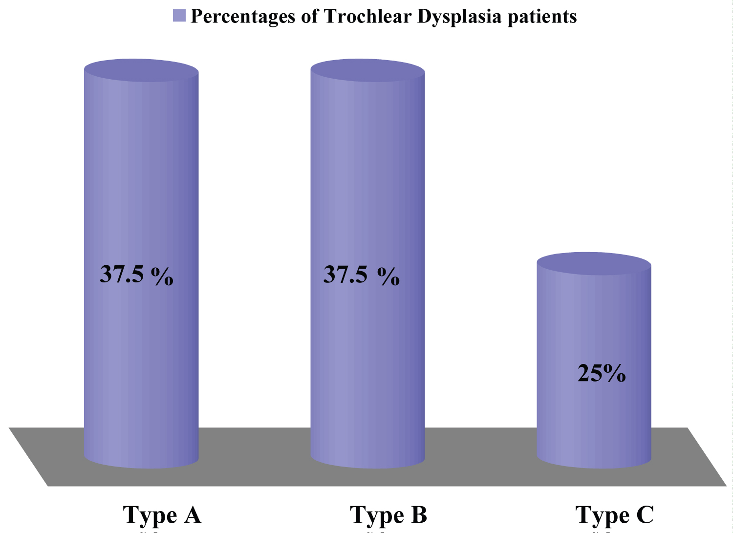 Figure 1: Demonstrates percentages of different grades of Trochlear dysplasia among the patients with patellar instability.