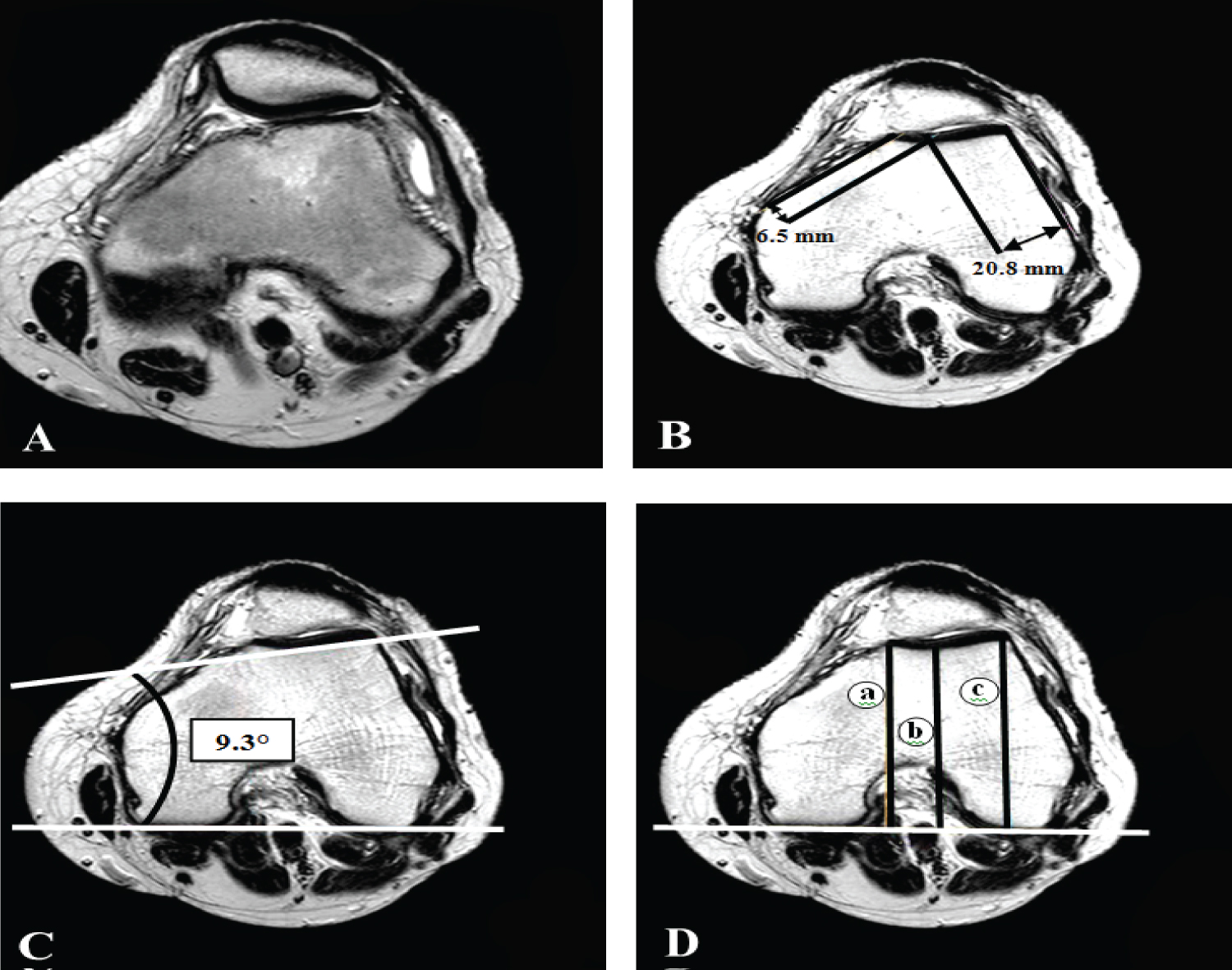 Figure 2: Axial T2 weighted images shows, A) Loss of contact between the patellofemoral joint surfaces laterally. B) Trochlear facet asymmetry 32% (normally not less than 40%), C) Lateral inclination angle 9.3° (normally not less than 11°), and D) Trochlear depth 1.7 mm (normally up to 3 mm), where a = 66.1 mm, b = 65.3 mm and c = 67.9 mm.