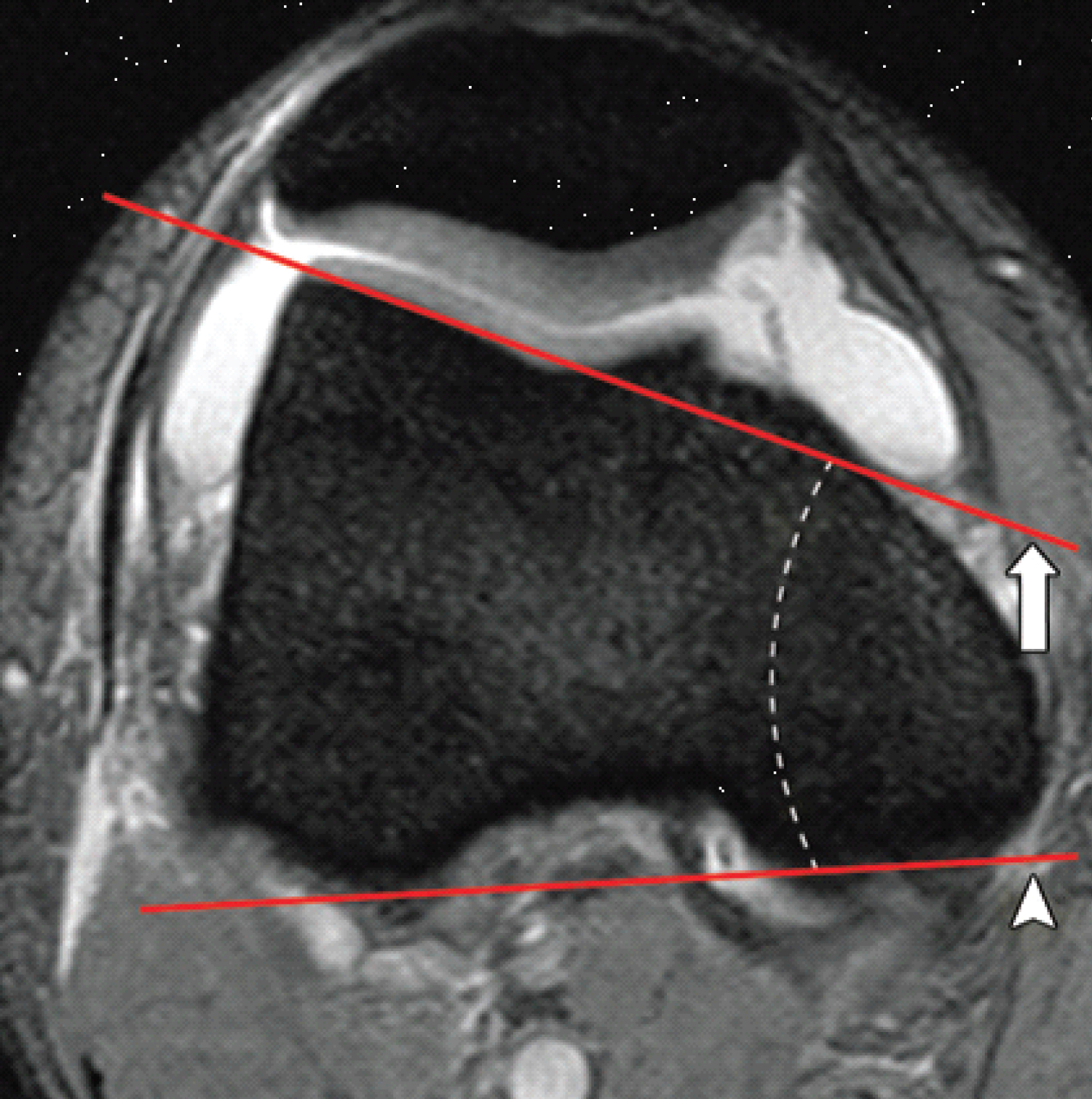 Figure 3: Lateral trochlear inclination assessed on axial fat-saturated T2-weighted MR images. A line (arrow) is drawn along the subchondral bone of the lateral trochlear facet, and a second line (arrow head) is drawn along the posterior aspect of the femoral condyles. The angle between the two lines is the inclination angle (dashed line). An inclination angle of less than 11° indicates trochlear dysplasia.