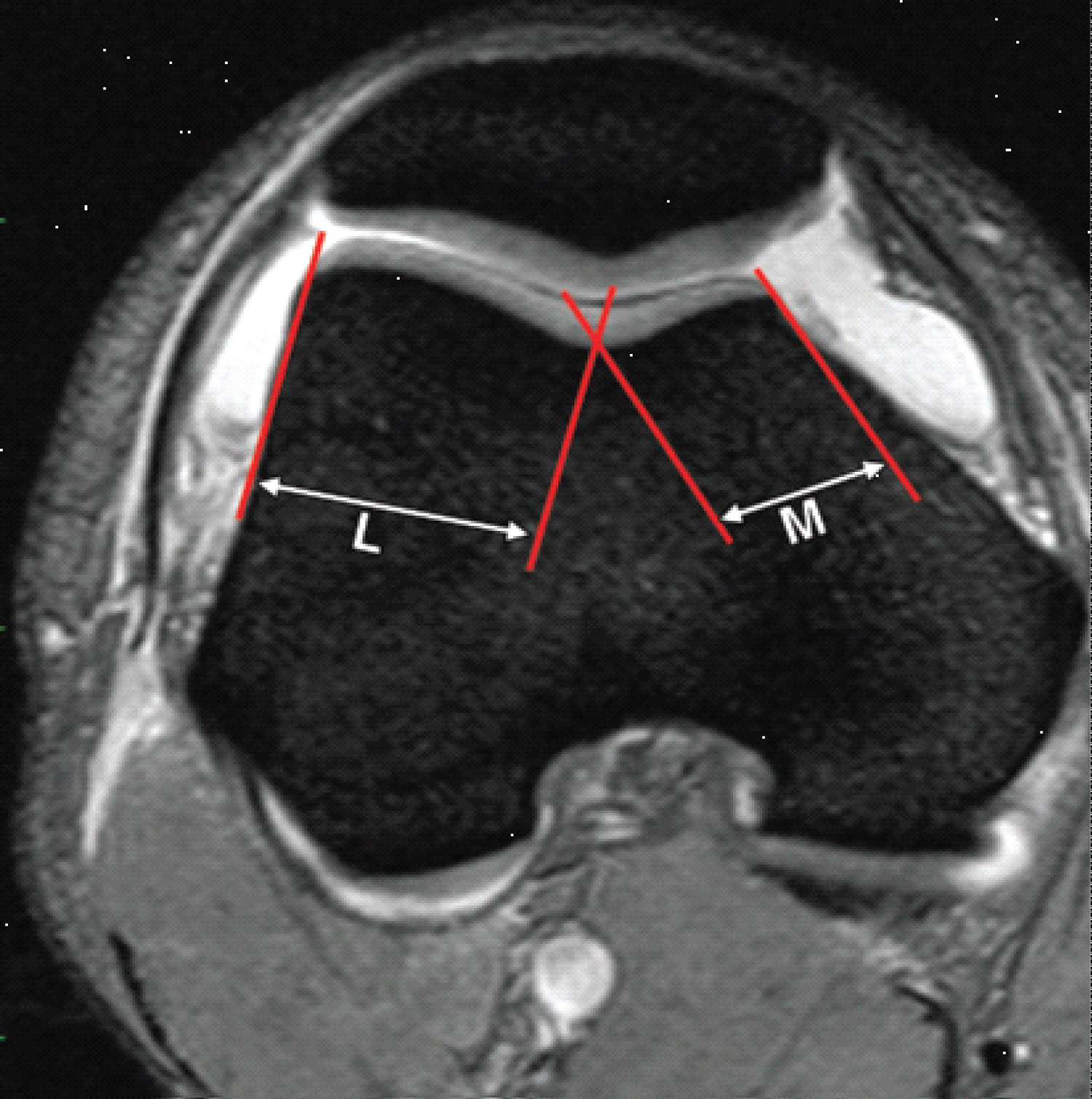 Figure 4: Trochlear facet asymmetry assessed on axial fat-saturated T2-weighted MR images. Asymmetry of the medial facet length (M) and the lateral facet length (L) is calculated as the ratio of the medial facet length divided by the lateral facet length expressed as a percentage (M/L × 100%). A trochlear facet ratio of less than 40% indicates dysplasia.