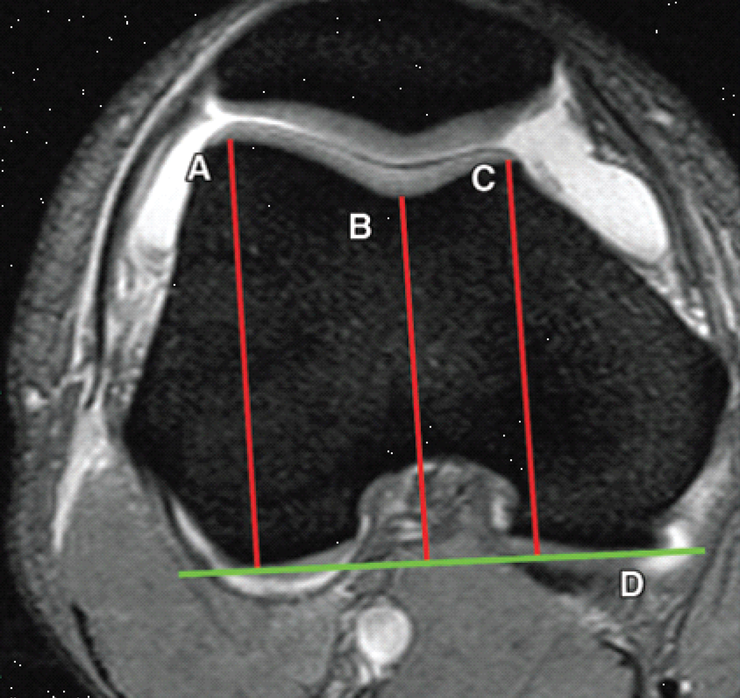Figure 5: Trochlear depth assessed on axial fat-saturated T2-weighted MR images. A line drawn parallel to the posterior aspect of the femoral condyles serves as a reference line (line D). The lines drawn perpendicular to the reference line indicates the largest anteroposterior diameters of the lateral (line A) and medial (line C) trochlear facets and the deepest point of the sulcus (line B). Trochlear depth is calculated as follows: (A + C/2) - B). A trochlear depth of 3 mm or less is assumed to indicate dysplasia.