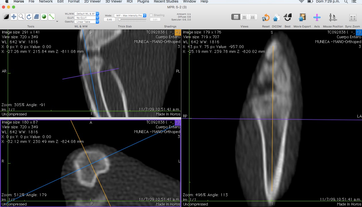 Figure 1: Image shows standardized measurements performed with the HOROS program under environment Mc Intosh. Multiplanar review for drawings to display sagittal, coronal and axial positions, taking as reference tibial plate and placing a centered parallel to the cortical and a perpendicular intercondylar line as guides.
