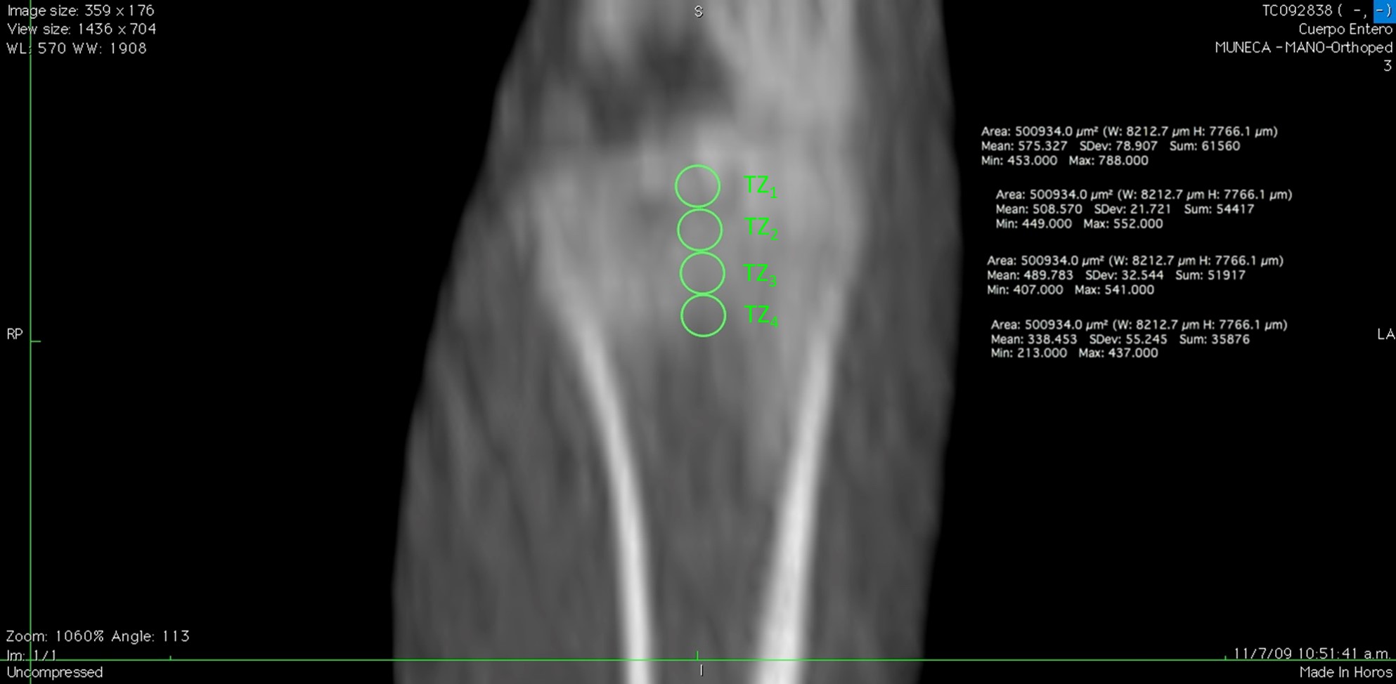 Figure 2: Image shows standardized measurements performed with the HOROS program under environment Mc Intosh. Thickness was 0.45 mm and a ROI (Region of Interest) for the measurement of density of 0.5 mm2 area. In this way four tibial zones (TZ1-4) were defined, from the tibial plate towards the metaphysis.