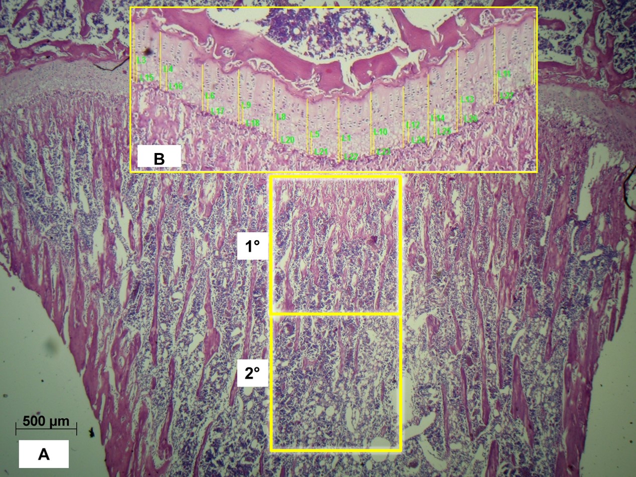On digital microphotographs, with the Image Pro Plus 2.0 program, the bone volume as a percentage of total bone volume (BV/TV%) of trabecular bone in the tibiae was determined on the central area of subchondral bone. Histomorphometric measurements were divided in primary (BVA/TVA%) and secondary (BVB/TVB%) cancellous bone (Figure 3A). Also, thickness of growth plate cartilage (GPC.Th) with its hyperthrophic zone (HpZ.Th) was determined as the mean of thirteen independent records (Figure 3B).