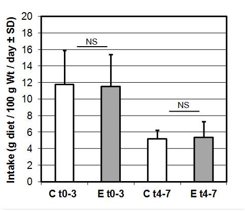 Figure 5: Intake (g diet/100g Wt/day) NS (p > 0.05) between groups, at 0-3w (t0-3) and 4-7w (t4-7). Data as mean ± SD control (C) and experimental (E).