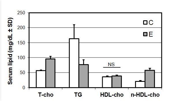 Figure 6: Serum lipid-lipoprotein profile (mg/dL): Total cholesterol (T-cho), triglycerides (TG), high density lipoprotein-cholesterol (HDL-cho), non-HDL-cholesterol (n-HDL-cho) at 7w. Data as mean ± SD control (C) and experimental (E). ***p < 0.0001; **p < 0.001; NS (p > 0.05).