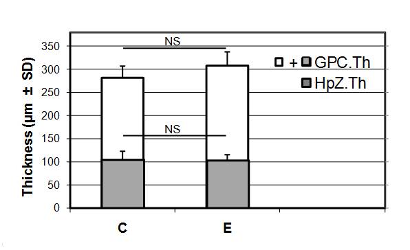 Figure 8: Thickness (μm) of growth-plate cartillage (GPC.Th) and Hypertrophic zone (HpZ.Th) at 7w. Data as mean ± SD control (C) and experimental (E). NS (p > 0.05).