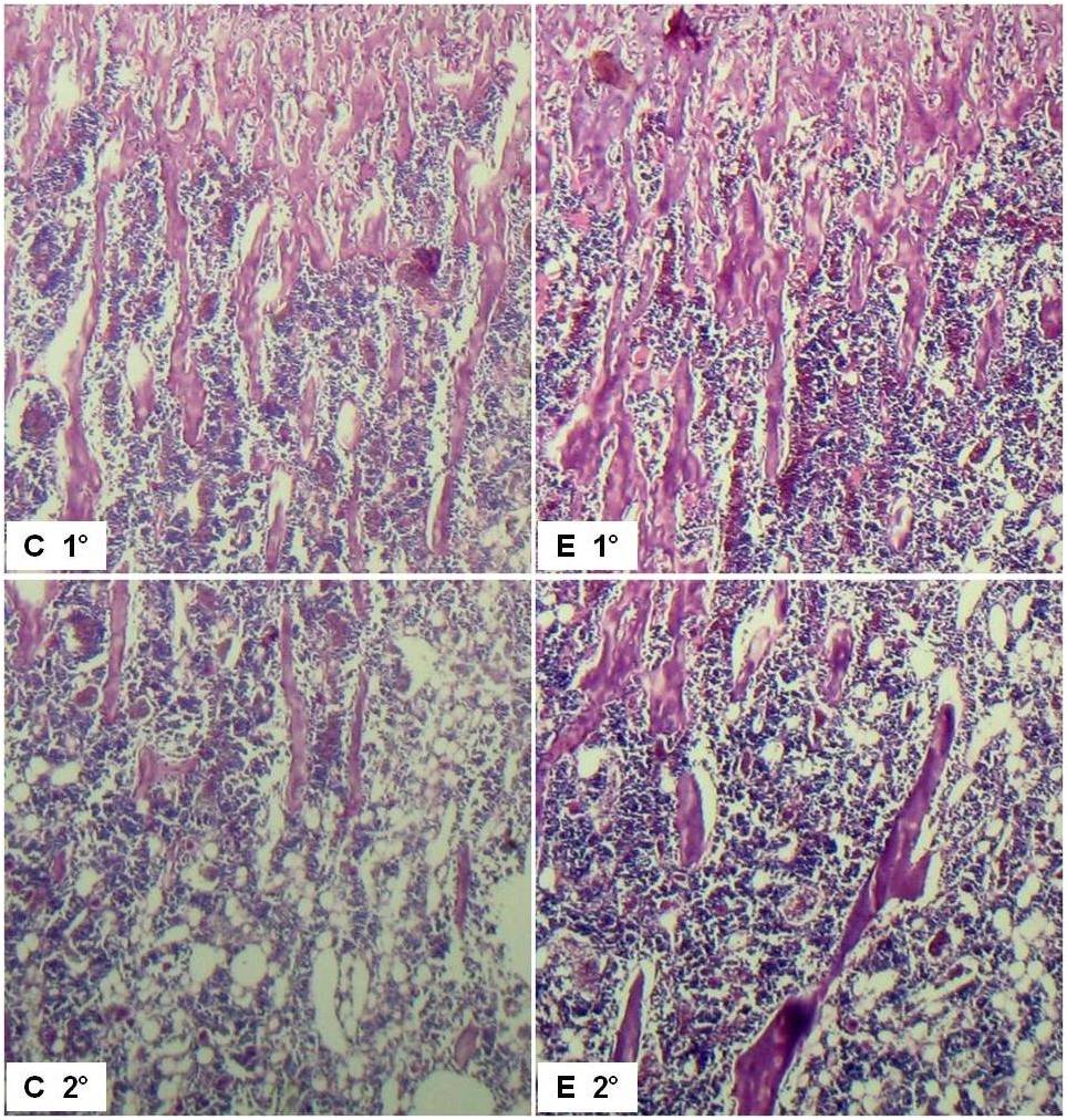 Figure 9: A) Digital micrographs of tibiae in longitudinal section, H & E 125X of control (C) and experimental (E), primary (1°) and secondary (2°) cancellous bone. B) Digital micrographs of tibiae in longitudinal section, H & E 125X of control (C) and experimental (E), ephyphyseal cartilage.