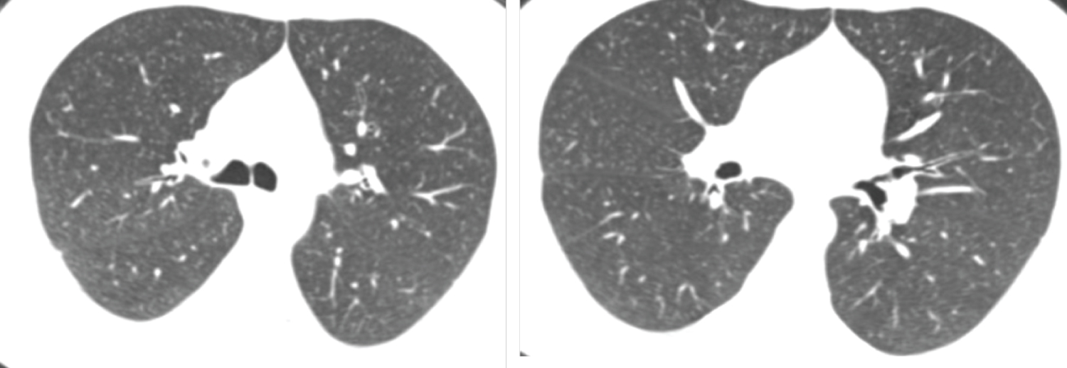 Figure 2: Male patient aged 49-years-old had negative initial reverse transcription-polymerase chain reaction results. Axial CT chest cuts show bilateral decreased both lung attenuation with increased both lung volumes denoting hyperinflation associated with bilateral upper lobe fine centrilobular ground glass nodular infiltration suggestive of smoking related bronchiolitis (respiratory bronchiolitis) (CORADS 1).