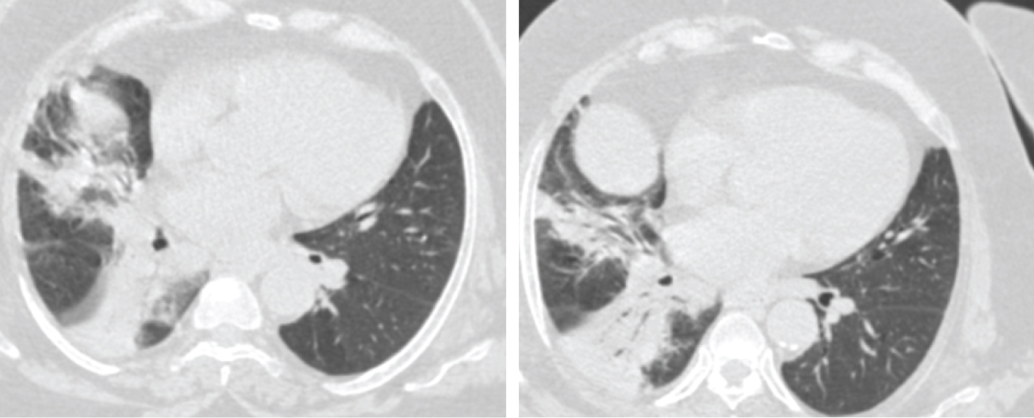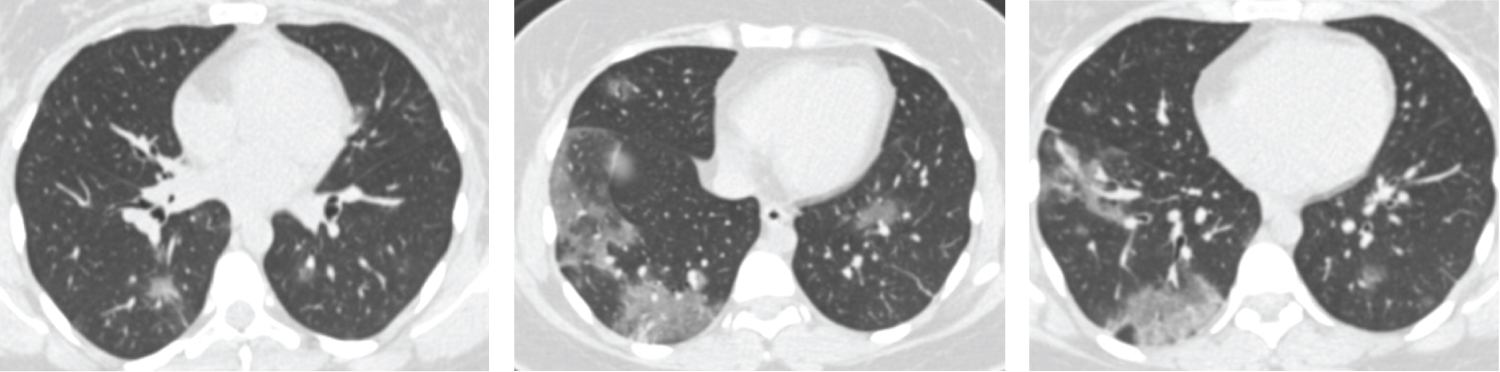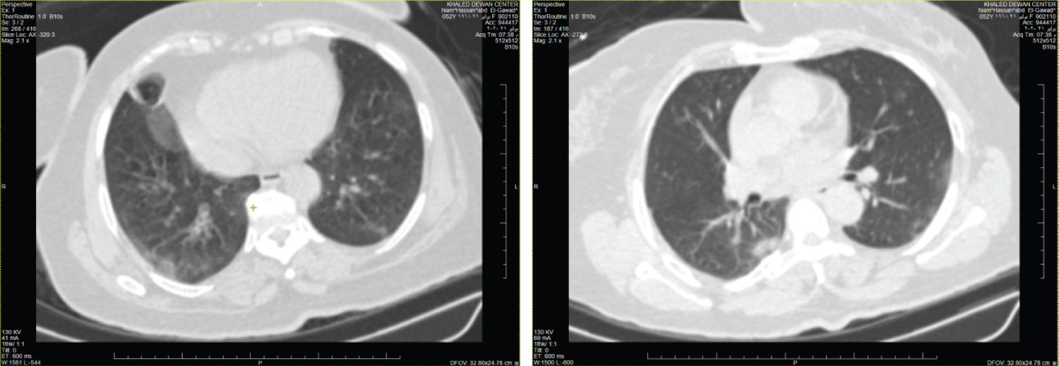 Figure 3: Female patient aged 56-years-old had positive initial reverse transcription-polymerase chain reaction results. Axial CT chest cuts show two patchy areas of consolidation with air bronchogram within are seen at middle lobe of right lung and right lower lung lobe these findings are unclear for COVID-19 (CORADS 3).