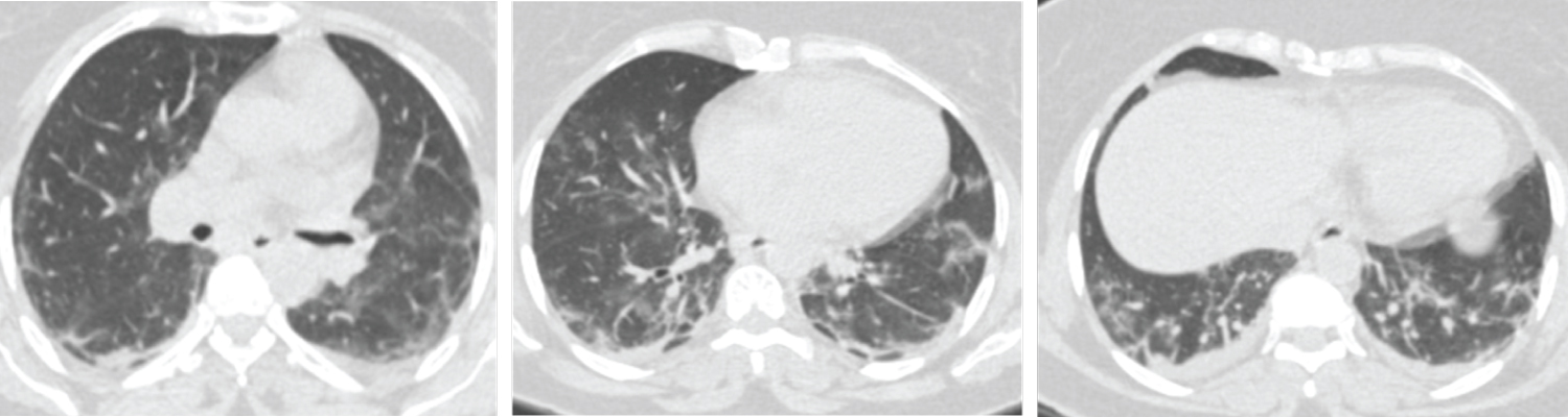 Figure 5: Male patient aged 60-years-old had positive initial reverse transcription-polymerase chain reaction results. Axial CT cuts show bilateral multi-focal ground glass opacities & smaller areas of consolidation are seen involving both lung fields with peripheral/subpleural predominance, this together with multiple subpleural lines this in keeping with viral pneumonia (COVID-19) (CORADS 5).
