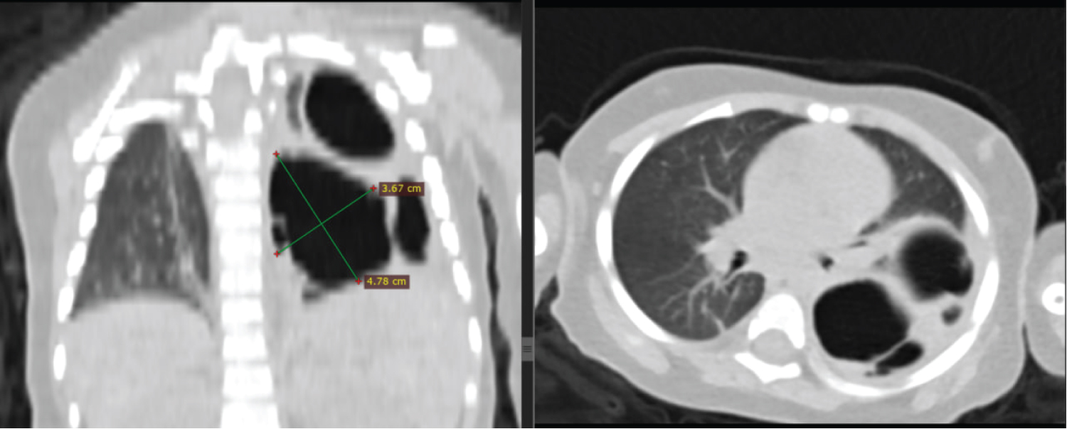 Initial non-contrast chest CT scan with 3 mm thickness revealed left side multiple cystic lucencies in mid and lower lung zone including retrocardiac location (Figure 1). The cysts were of variable sizes, and the largest cyst was 4.7 cm in diameter and was located at left lower lobe displacing the normal lung parenchyma (Figure 2). There was visible communication with the bronchial system. No soft tissue component was observed. Other mediastinal structures, pleura, and chest wall showed normal findings. There was no evidence of enlarged lymph nodes or mass lesions. The airways and fissures were well demonstrated, and no aggressive osseous lesions were seen. The final diagnosis was consistent with congenital pulmonary airway malformation type 1 (Stocker’s classification).