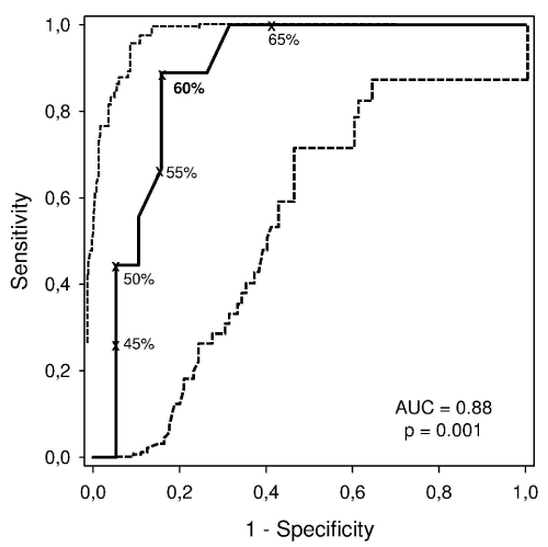 Figure 1 includes a ROC curve with the best DLco (% predicted) cut-off points for the evaluation y during the 3-month follow-up period, including respective AUC calculations (AUC= 0.88; p = 0.001).