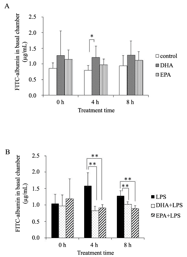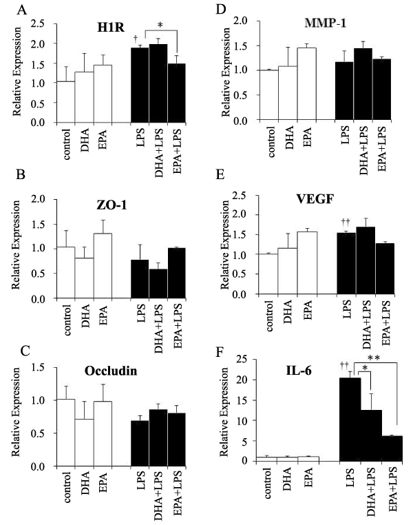 Results: Pretreatment with DHA and EPA prior to LPS stimulation significantly attenuated LPS-induced cell permeability. EPA decreased histamine receptor 1 (H1R) mRNA expression following LPS stimulation. Interleukin (IL)-6 mRNA expressions in response to LPS treatment was significantly reduced by both DHA and EPA pretreatment.