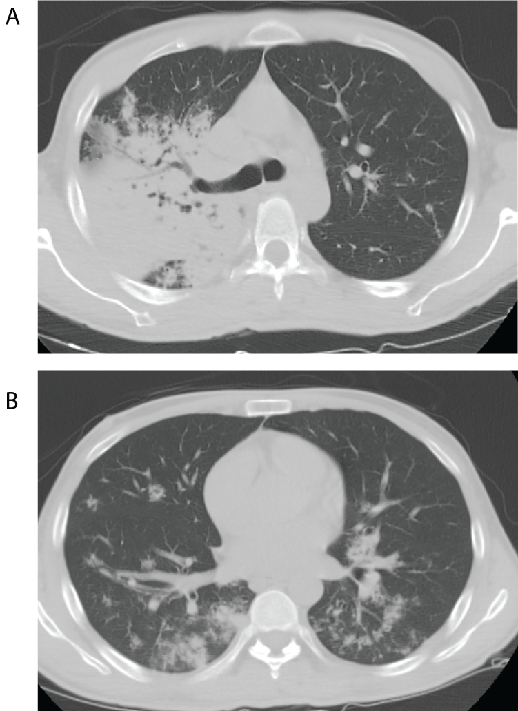 A young 32 year old Hispanic man presented with 4-weeks history of polyuria, polyphagia and weight loss and 2-weeks history of hemoptysis and shortness of breath. He denied fever, chills, night sweats, sick contacts, skin rash, glandular swelling or recent travel. He was a farmer who had emigrated from Mexico to New York City over a year ago and was currently working at a local grocery store. He denied any prior history of pulmonary symptoms. On examination the patient was cachectic, febrile, tachycardic and tachypneic and in respiratory distress. There were bronchial breath sounds in the right infraclavicular area. Laboratory investigations revealed mild leukocytosis and diabetic ketoacidosis (DKA). The chest X-ray (Figure 1) showed a dense right upper lobe infiltrate with bronchiectasis. A chest computed tomography (CT) (Figure 2) showed cavitary consolidation of the right upper lobe with patchy infiltrates in the right and left lower lobes.