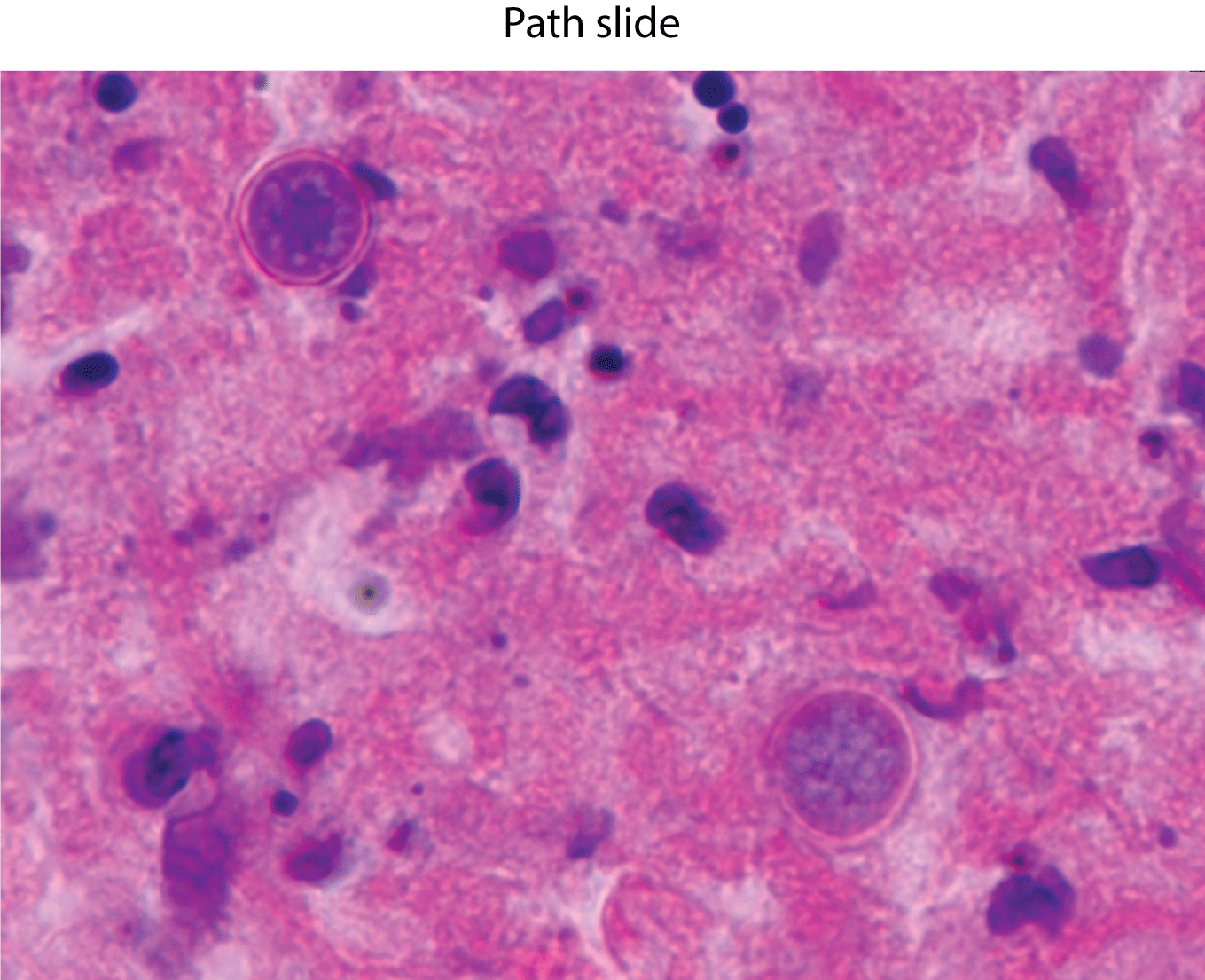 Coccidioidomycosis (Valley fever) is caused by inhalation of Coccidioides spores - Coccidioides immitis typically in San Joaquin Valley of California and Coccidoides posadasii, typically outside of California [1]. It is a dimorphic soil dwelling fungus. Coccidoides immitis was first identified in 1892 in Argentina but its pulmonary manifestations and understanding of its mode of transmission was not clear until the 1940s [2]. We now know that Coccidioides found predominantly in the soil of warm, arid desert regions of the Western hemisphere located between the north and south 40° latitudes. This area encompasses California, Nevada, Utah, Arizona, parts of Texas, New Mexico and Mexico, where our patient emigrated from. Transmission is via inhalation of soil particles containing Coccidioides spores. Given his prior occupation as a farmer, it is reasonable to suggest that he has been carrying the fungus for a period of time prior to his presentation. However, coccidioidomycosis is typically a primary lung infection, not reactivation. After inhalation of Coccidioides spores, 60% of infected persons remain asymptomatic while the rest develop mild-to-severe pulmonary disease with only 1% developing disseminated disease [3].Risk factors for severe disease include African or Filipino descent, advanced age, T-cell immunosuppression from any cause including AIDS, pregnancy and diabetes mellitus.