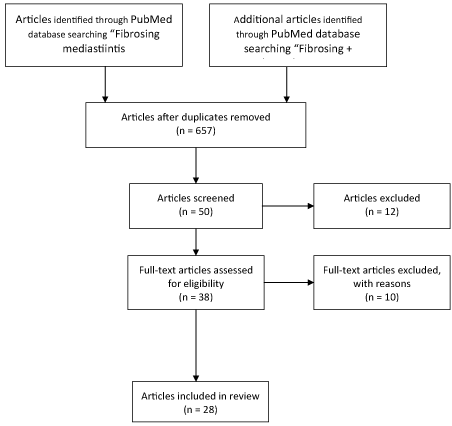 Database searches conducted during the initial review done via institutional database proxy. Access granted through shared agreement with medical education and partnering medical institution. The database search was conducted using the key terms "fibrosing mediastinitis" and "fibrosing plus histoplasmosis". These terms were chosen due to the specific nature and etiology of the presenting case. During this initial database search, over 600 articles identified. Further truncating done to eliminate articles not within the last 30 years. Exception made for early case studies [1]. All articles cited were fully accessible electronically. Fifty total articles were screened with 28 articles directly cited in the preceding work. Further articles were eliminated due to relevancy (Figure 1).