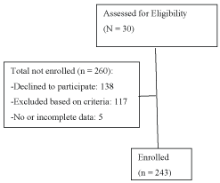 A total of 503 patients who underwent diagnostic polysomnography (PSG) for suspected OSA from November 1, 2011 until December 31, 2012 were screened for eligibility for the study. The inclusion criteria were as follows: (1) Age 18 to 90 years old; (2) Clinical suspicion of OSA; (3) CPAP naïvete; (4) Willingness to use CPAP; and (5) Consent to participate in the study. The exclusion criteria were as follows: (1) Age < 18-years-old; (2) Refusal to use CPAP; (3) Previous or current CPAP use; (4) Self-pay or lack of health insurance preventing use of CPAP; (5) Inability to read, comprehend, or complete research questionnaires. After screening for eligibility based on inclusion and exclusion criteria, a total of 243 participants were included in the sample (Figure 1).