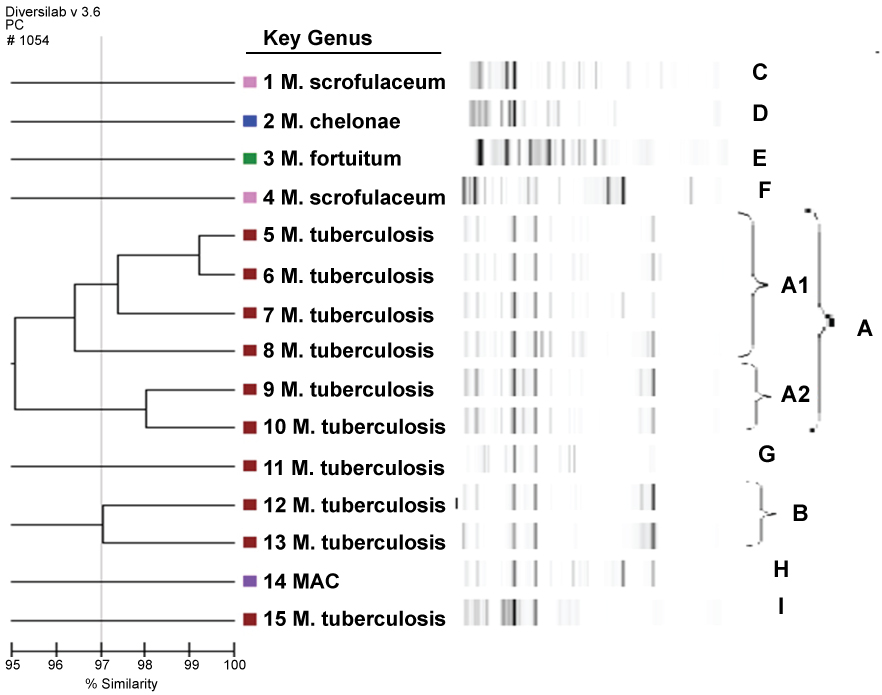 Nine of the strains were identified as MTBC and six strains were identified as NTM by the SD rapid test methods. Five of the strains were identified as NTM by the rep-PCR method as two M. scrofulaceum, M. chelonae, M. fortuitum and M. avium complex (MAC). By genotyping with rep-PCR a total of nine clones were identified, which included two main clones (A and B) and seven other clones (C, D, E, F, G, H, I).