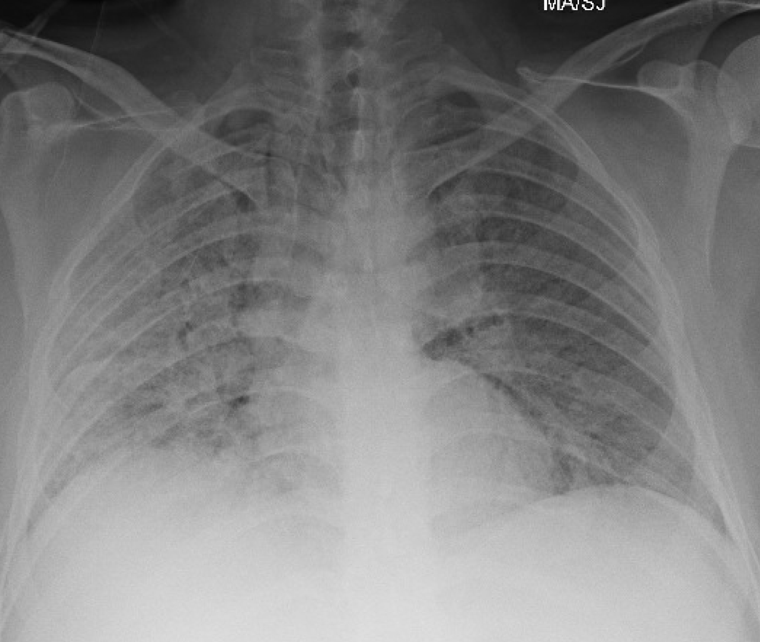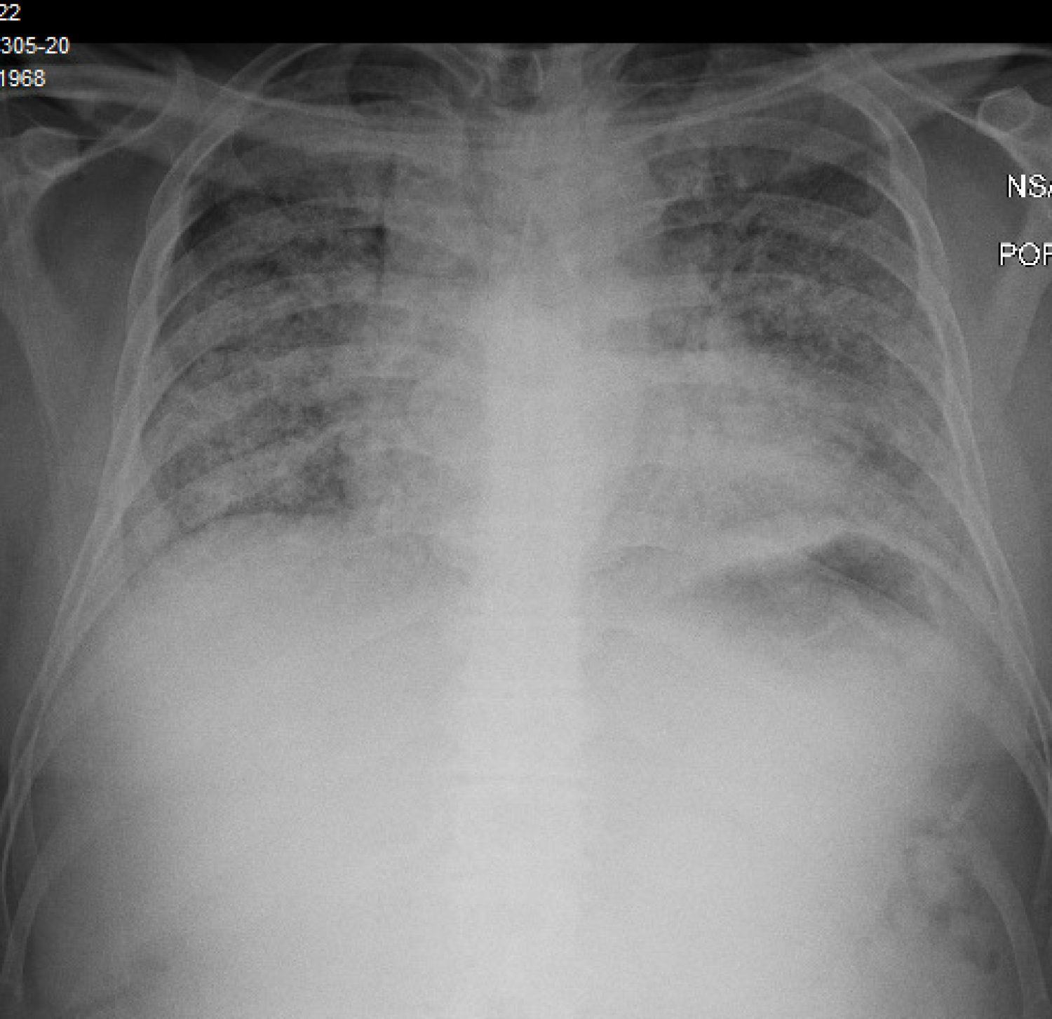 A 34-year-old Hispanic male, never smoker with no significant medical history was admitted with two-week history of non-productive cough, diarrhea, non-bloody, non-bilious emesis and subjective fevers. On admission, he was afebrile, tachycardic with a heart rate of 140 beats per minute, and oxygen saturation 90% on room air and 99% on 4 liters per minute nasal cannula. He was found to have severe Acute Respiratory Distress Syndrome secondary to SARS-CoV-2 viral pneumonia, with a PaO2:FiO2 ratio of 59. Admission labs revealed normal WBC count, lymphocytopenia of 6% and an absolute count of 640/mm3. CRP elevated at 26.9 mg/dL, LDH elevated at 353 U/L, D-dimer elevated at 0.66 ug/mL and ferritin elevated at 478 ng/mL. His chest x-ray revealed bilateral diffuse infiltrates. A CTPE study done by the emergency department to rule out pulmonary embolism revealed patchy bilateral pulmonary consolidation and no evidence of filling defects. There was also no evidence of bullous lung disease. He was treated with a course of hydroxychloroquine, azithromycin, and methylprednisolone. He received tocilizumab and convalescent plasma. His hypoxia worsened during the hospital course, eventually requiring 100% NRB mask and 6 liters per minute nasal cannula in tandem to maintain his oxygenation. On day 18 of his hospitalization, he had persistent hypoxemia with worsening respiratory distress. Patient refused intubation. During the hospital course, he was managed conservatively, and was noted to have slowly decreasing oxygen requirements. On hospital day 36, he developed pneumomediastinum (Figure 3) likely secondary to violent coughing, which eventually improved with conservative management. Chest X-ray done prior to discharge revealed significant improvement in bilateral consolidations and resolution of pneumomediastinum. After six weeks since hospital admission, the patient was discharged home on 2 liters per minute nasal cannula.