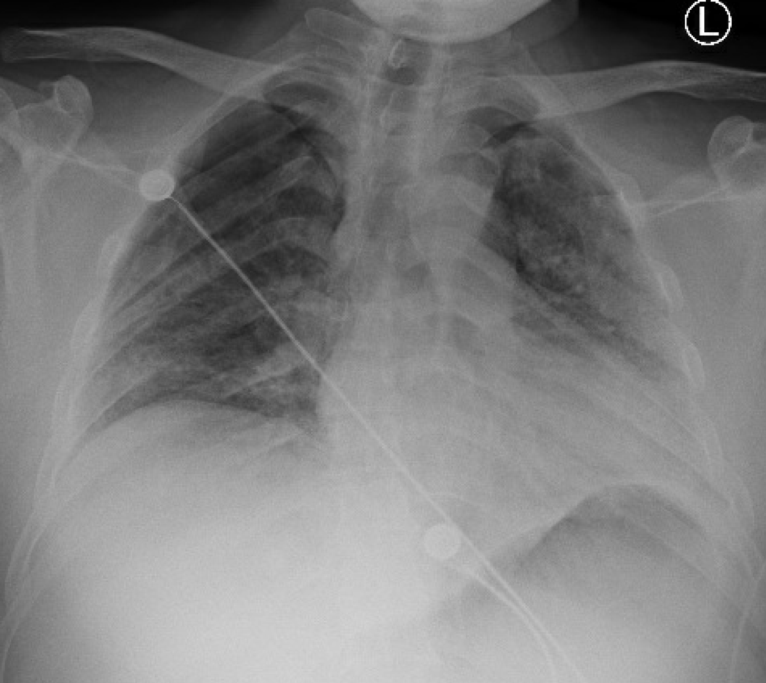 A 51-year-old obese Hispanic male, never smoker with no significant medical history was admitted with three days of cough, chills and dyspnea. On admission, his temperature was 103 degrees Fahrenheit and oxygen saturation was 88% on 100% non-rebreather mask (NRB). He was found to have severe Acute Respiratory Distress Syndrome secondary to SARS-CoV-2 viral pneumonia, with a PaO2:FiO2 ratio of 68. Admission labs revealed normal WBC count, CRP elevated at 10.1 mg/dL, LDH elevated at 439 U/L, D-dimer elevated at 0.40 ug/mL and ferritin elevated at 489 ng/mL. His chest X-ray showed bilateral diffuse infiltrates. He was treated with a course of hydroxychloroquine, azithromycin, and methylprednisolone. He received tocilizumab and convalescent plasma. He continued to require 100% NRB mask to maintain his oxygenation. On day 15 of his hospitalization, he developed sudden chest pain and worsening hypoxemia. Chest X-ray revealed right sided apical pneumothorax and pneumomediastinum (Figure 1). He had a chest tube placed with improvement in his oxygenation. His pneumothorax and pneumomediastinum resolved after which chest tube was removed. He was discharged to rehabilitation facility on oxygen therapy 3 liters per minute nasal cannula. He had a CT thorax done eight weeks later which showed peripheral ground glass opacities with bronchiectasis. No significant underlying bullous lung disease noted. There was also no evidence of residual pneumomediastinum.