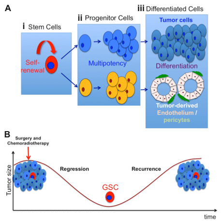 cell division to self-renew (i) and generate progenitor cells (ii) that differentiate to tumor lineages, including tumor endothelium and pericytes (iii). B. Surgical resection and conventional chemoradiotherapy result in cytoreduction and decrease in tumor size. However, GBM stem cells (GSCs) show remarkable resistance to radiation and chemotherapy and generate tumor recurrence.