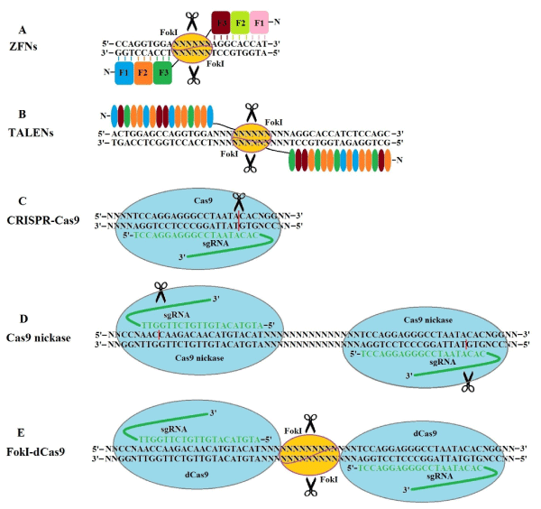 (A) zinc-finger nucleases (ZFNs). ZFNs recognize two half-sites of the target site with a manner of three base pairs per finger domain.