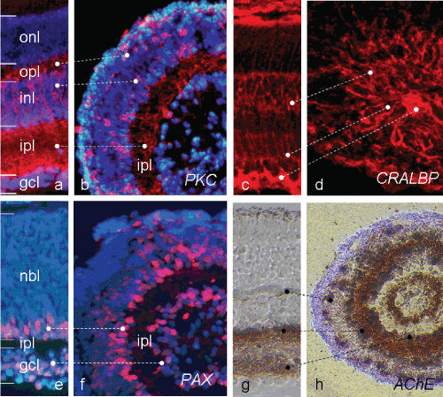 Figure 2: Distinct effects of treatment with Wnt3a (d, f, g) as compared with RPECM (b, c) on reaggregating cells from the perinatal Gerbil retina. In absence of both (a), in 10-days-old (10 div) spheroids, processes from circularly arranged calretinin+ amacrine cells (CR+ ACs; red) reach internally to form ipl-like neuropil spaces (see centres of a). In presence of RPECM (b; scheme II of Figure 1), a laminar ipl has formed near the sphere surface. XAP-1-stained PR precursors are located more to the center (c). In contrast, Wnt3a supplementation for 10 days (d, f, g; scheme III of Figure 1) induces a correct laminar inside-out polarity (double arrow in d; cf. with a section of a CR-stained P10 Gerbil retina in e). Compared with the control (a), DAPI in (d, f; blue) stains a compact ring of cells in the outer half sphere (note columnar arrangement of cells, dashed lines in f) with individual cells separating into a cell-free inner space (d, f). In (d) few CR+ ACs are arranged in an inner ring (dashed double line). In (f), XAP-1 staining reveals photoreceptor precursors correctly located along the sphere surface. Formation of PR outer segments is announced by CR staining (star in d; cf. [32]). AChE staining further supports the internal location of the ipl (g); some of these cells appear pair-wise (arrows). In (h; scheme IV of Figure 1), a shorter Wnt3a exposure of only 4 div still induced a correct laminar polarity, and allowed further sphere differentiation. Compared with (d, f, g), many more CR+ ACs extended their neurites into the ipl (red, dashed circle along inner ipl border); several PRs near the sphere surface are labelled by the rho4D2 antibody (green, arrows), where cell-free spaces announce formation of an opl (outer dashed line). Bars = 50 μm. View Figure 2