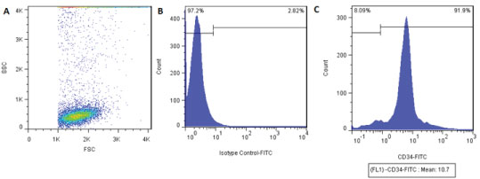 Figure 1: Flowgram of CD34+ cord blood cells purity percentage. A) Distribution of cells by size and granularity; B) Control isotype; C) CD34+ cell distribution after purification by the MidiMACS column. View Figure 1