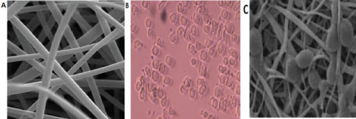 Figure 2: Images of light and electronic microscopes. A) Scanning electron micrograph of polycaprolactone nano-fibers; B) CD34+ CB cells cultured in 2D medium and; C) CD34+ CB cells cultured in PCL nano-fiber scaffold coated with Collagen after 10 days. View Figure 2