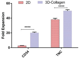 Our electrospun fiber scaffolds are their microscale construction with greater surface-to-volume ratio and capacity to selectively enhance absorption of ECM proteins that are able to regulate communications of the cells with the microenvironment and cell interaction [14]. In 2D cell culture system, this communication capacity is low and restricted to neighboring cells, therefore, TNC and CD34+ cell expansion in 2D is lower than 3D.