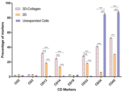 Figure 4: Frequency of surface linage markers compared among unexpanded cells, 2D, and 3D cells after 10 days culture. Hematopoietic stem cell (CD34+), pan-leukocyte (CD45), granulocytes (CD13 and CD33), lymphocytes (CD2, CD3, and CD19) and monocyte (CD14) markers in unexpanded cells, 2D and 3D cell culture systems after 10 days expansion. View Figure 4