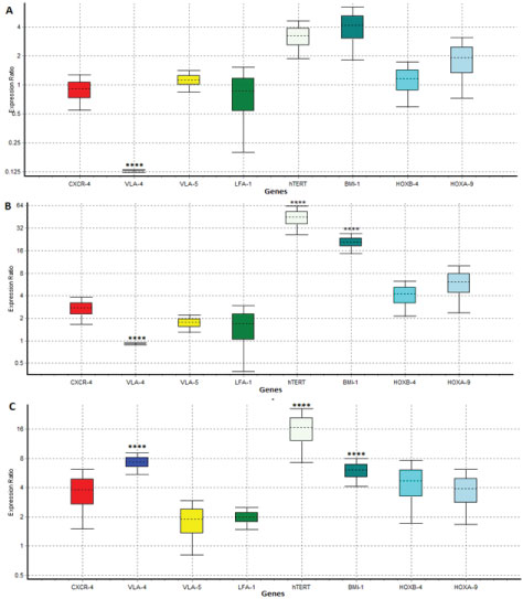 The importance of HOXB-4, BIM-1, HOX-A9, and hTERT in HSC self-renewal has been demonstrated before [15]. Several studies revealed that amplified expression of Bmi-1 and HOXB-4 directed to the symmetrical cell division of HSC and effects in HSC expansion [22,23]. Also, other studies exhibited an ectopic expression of HOXB-4 can mediate a significant expansion of HSC and also HOXB-4 and HOXA-9, enhance HSC activity [24].