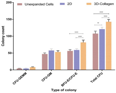 Investigation of amplification of CD34+ cells with a CFC assay showed greater colony forming capability of cells cultured in the 3D PCL-Collagen scaffold than 2D method. In particular, a statistically significant difference between the 2 tested culture conditions was detected in BFU-E and total CFU cells after day 10 of culture. This finding suggested that 3D culture allows maintenance of hematopoietic cell quality for a longer time.