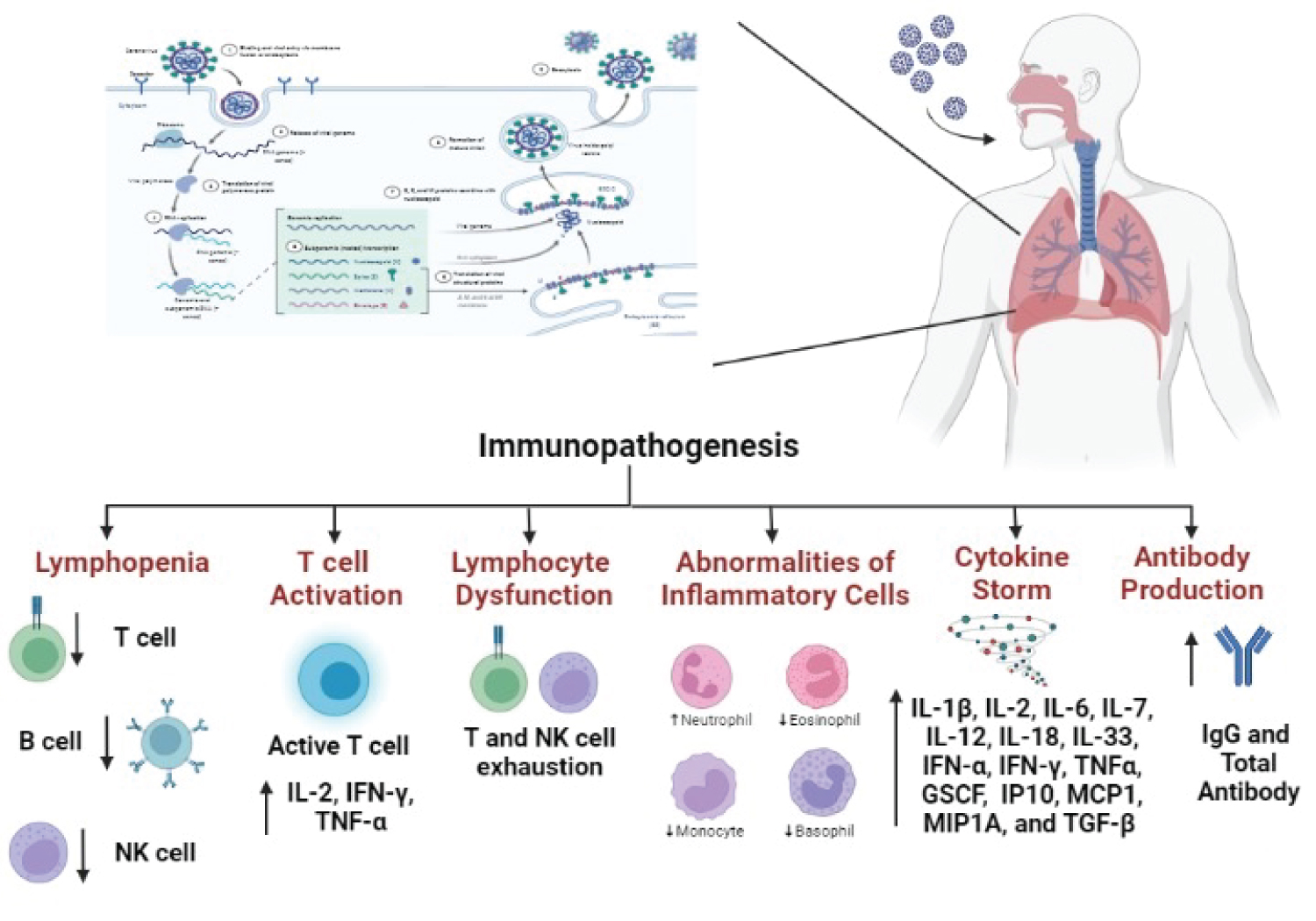 Figure 2: COVID-19 immunopathogenesis. In the pathogenesis of COVID-19, lymphopenia, T-cell activation, lymphocyte dysfunction, inflammatory cell abnormalities, increased cytokine and antibody production are observed.