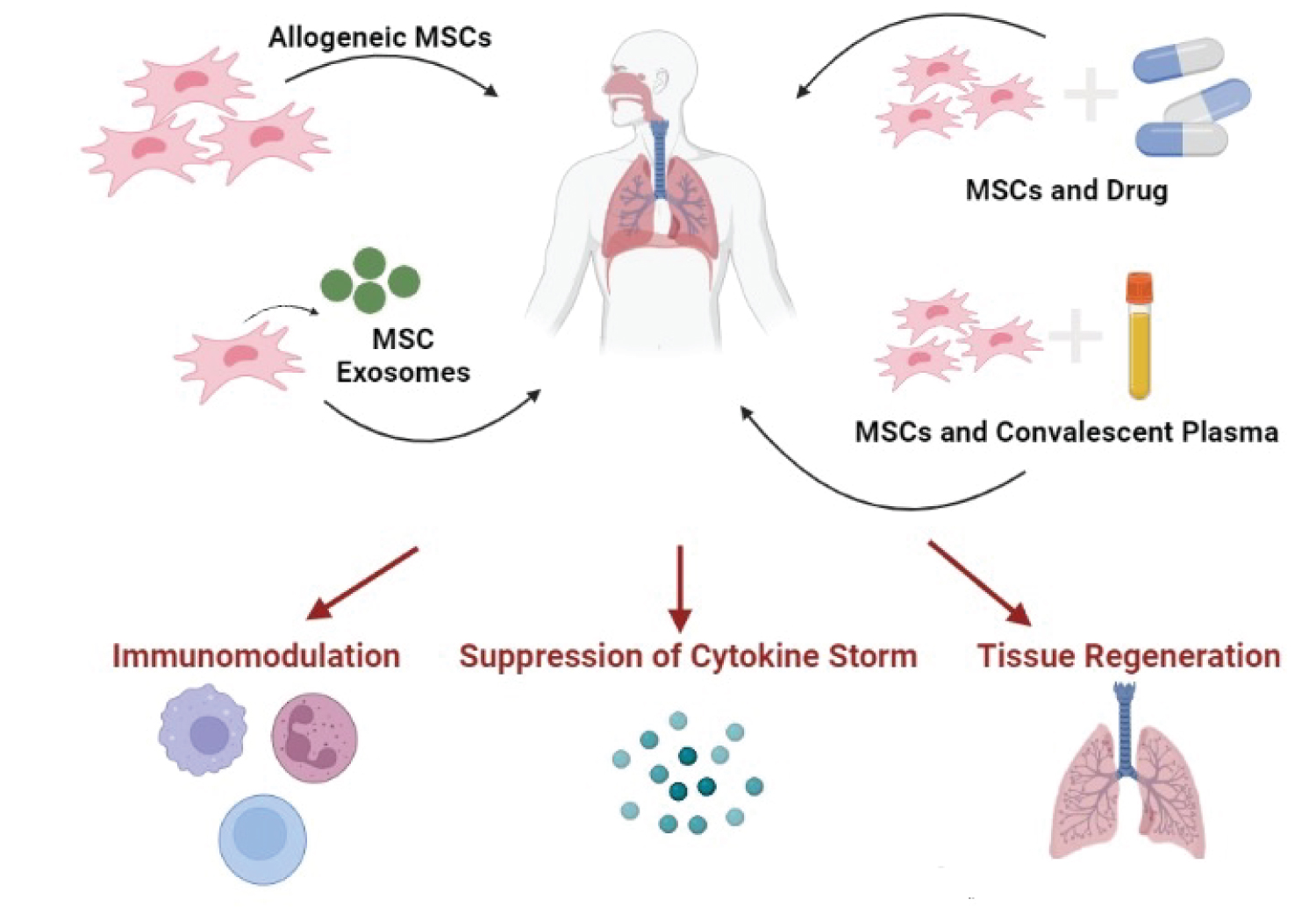 Figure 3: MSCs can be used in different combinations in the treatment of COVID-19 and can modulate immune cells from pro-inflammatory to anti-inflammatory phenotypes, suppress cytokine storm and induce lung regeneration.
