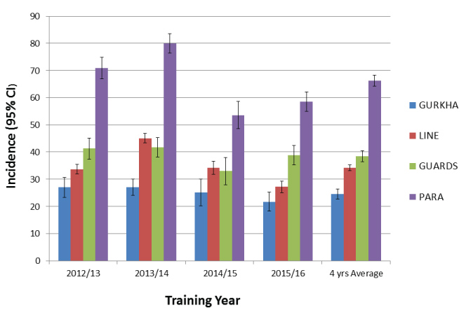 Figure 4 presents a four year average incidence (with 95% CI) of MSKI according to anatomical location. The parachute regiment had the highest recorded incidence of injuries reported at the calf and shin (10.94%) followed by knee (9.74%). Conversely, injuries to the knee were the most frequently observed for Guards (6.37%), Line (7.04%) and Gurkha recruits (9.26%) with the second most common reported at the ankle for Guards (5.19%), Line (5.72%) and Gurkha (5.92%).