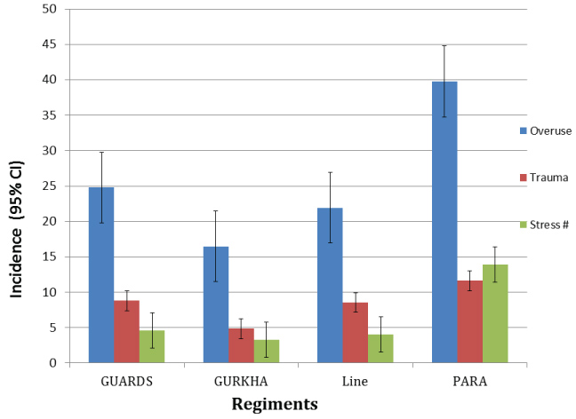 The observed regimental injury pattern in terms of onset and anatomical location is similar to previous investigations within both military [1,5,7,9] and sporting populations [34]. Overuse injury is the most common for all CIC regiments, a characteristic observed in numerous other studies [1,5,8,9,15]. However, regimental specific injury data, including type and anatomical location, has been lacking in previous studies. To the best of the author's knowledge, this is the first study to examine regimental specific injury incidence based on anatomical location in the British infantry recruit population.