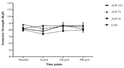 Figure 3: Comparison of isometric strength levels at rest, 1 h, 24 h, and 48 h after resistance exercise performed at different levels of AOP (n = 12). CON: Control condition with no occlusion; AOP-50: Experimental condition at 50% of Arterial Occlusion Pressure; AOP-75: Experimental condition at 75% of Arterial Occlusion Pressure; AOP-100: Experimental condition at 100% of Arterial Occlusion Pressure. View Figure 3