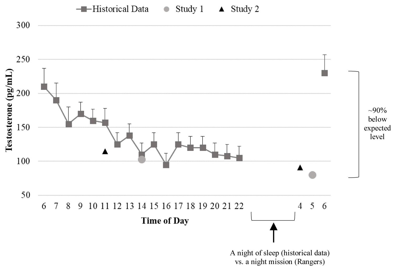 As shown in Figure 1, although Baseline testosterone was in the expected range (compared to historical values), Ranger Sleep Loss testosterone values were roughly 90% lower than expected at the time of the morning testosterone peak.