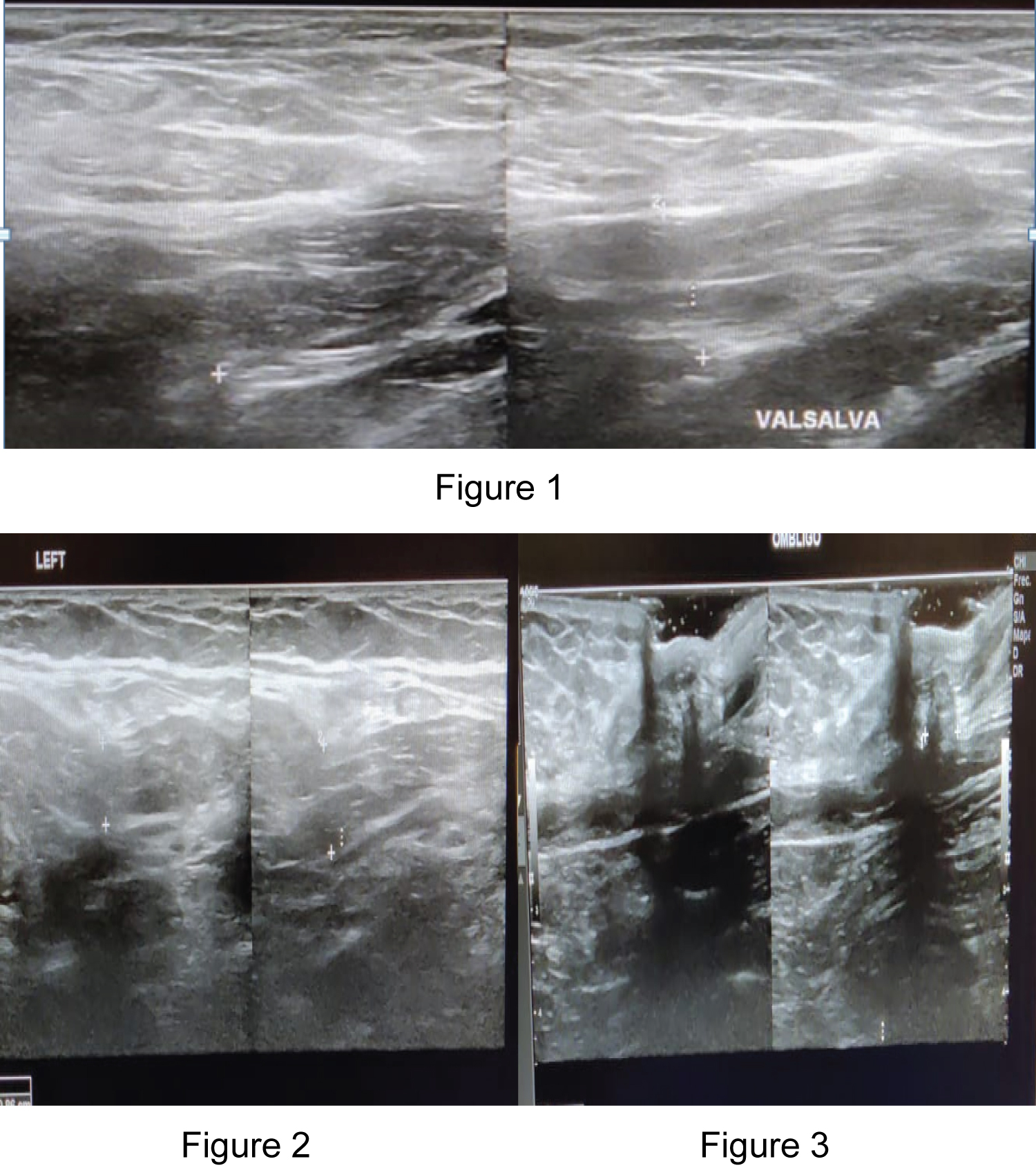 Figure 1, 2 and 3: The diagnostic protocol was started where the presence of bilateral inguinal and umbilical hernia was evidenced, for which a surgical programming was decided to perform abdominal wall plasty.