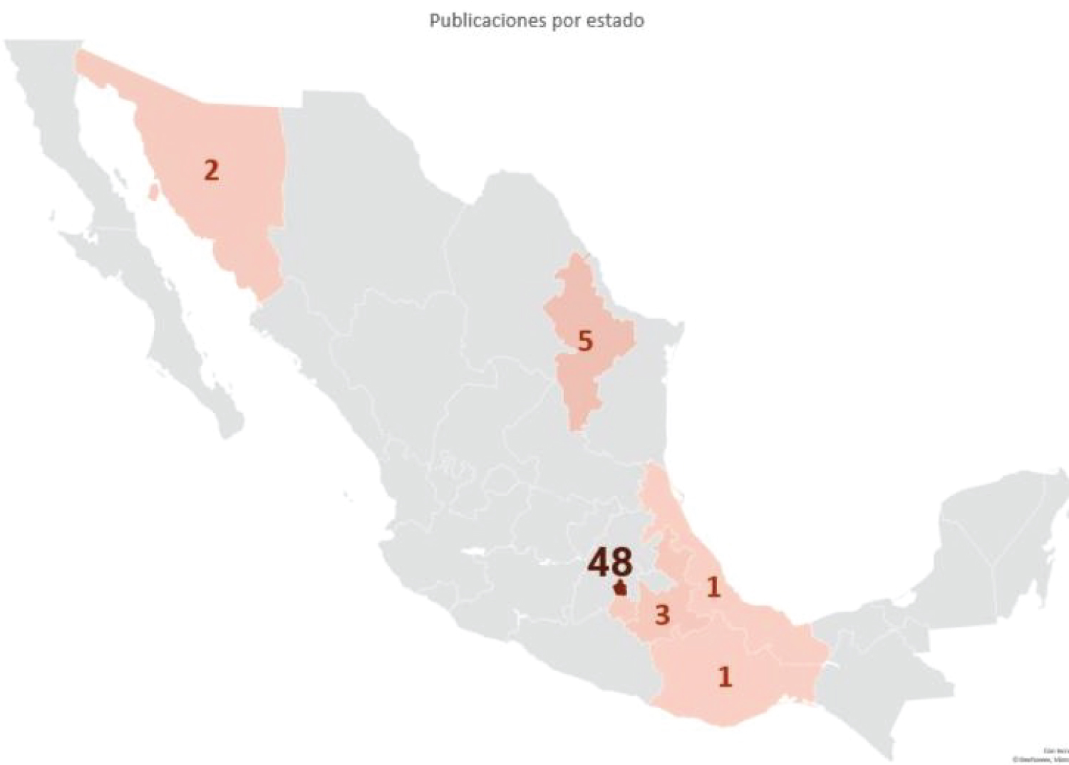 The map shows that the production of publications in international journals is concentrated in the urban areas of the country. Mexico City, for example, represents 83.2% of the total publications (Figure 1).