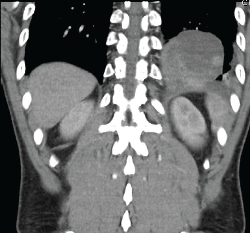 On examination post significant amounts of morphine he appeared comfortable. He was afebrile and apart from a mild tachycardia he had otherwise unremarkable vital signs. His cardiovascular examination was normal, he had slightly decreased breath sounds at his left base and had mild flank tenderness. The remainder of his abdominal examination was unremarkable.