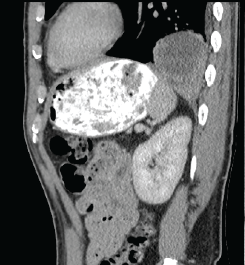 Our patient presented to the emergency department of our tertiary hospital with severe abdominal pain that had started suddenly. He was a fit thirty-year-old male who had no significant medical history apart from being an ex-smoker who was not on anymedications. He required significant amounts of opioid pain relief on arrival to control his pain.