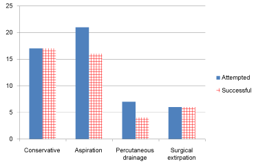 Factors significantly impacting on the length of hospital stay during repair of incisional hernia are shown in Table 4. One hundred and sixty-nine (82.4%) of the patients were not readmitted following repair of their incisional hernias. Of the remaining, 18 (8.8%) were readmitted due to seroma complications, 12 (5.9%) due to infection/wound dehiscence, two (1%) each due to enterocutaneous fistula, haematoma and pain. The overall readmission rate was 17.6% with a reoperation rate of 10.3% (21 patients). The management of seroma comprised conservative treatment in 17; aspiration in 21 patients who had 70 episodes (6 × 1; 7 × 2; 1 × 3; 2 × 4; 2 × 5; 1 × 7; and 2 × 11 (2 patients had 11 each); percutaneous drain age in seven; and surgical extirpation in six. The success rates of the various modalities for treating seroma are shown in Figure 3. Three patients in whom percutaneous drainage failed were eventually treated by surgical extirpation. Of the five not successfully treated by aspiration, two were treated by percutaneous drainage and three by surgical extirpation.