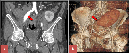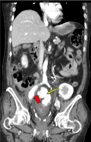 Figure 1: Computer tomography scan of abdomen and pelvis with intravenous contrast, coronal view. Demonstrating a pseudoaneurysm arising off right common iliac artery (short red arrow) with free pelvic fluid concerning for an associated leak from the pseudoaneurysm. Demarcation of the sigmoid colon with contrast (long yellow arrow) in close proximity to the pseudoaneurysm. View Figure 1