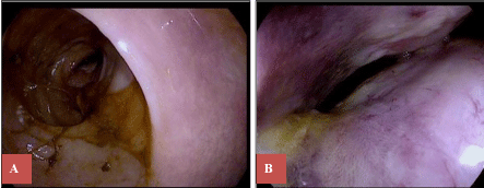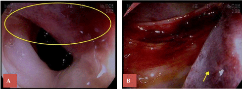 Figure 3: A) Area of suspected fistula encircled; B) Sub-mucosal hematoma between 25-35 cm from anal verge (arrow). View Figure 3