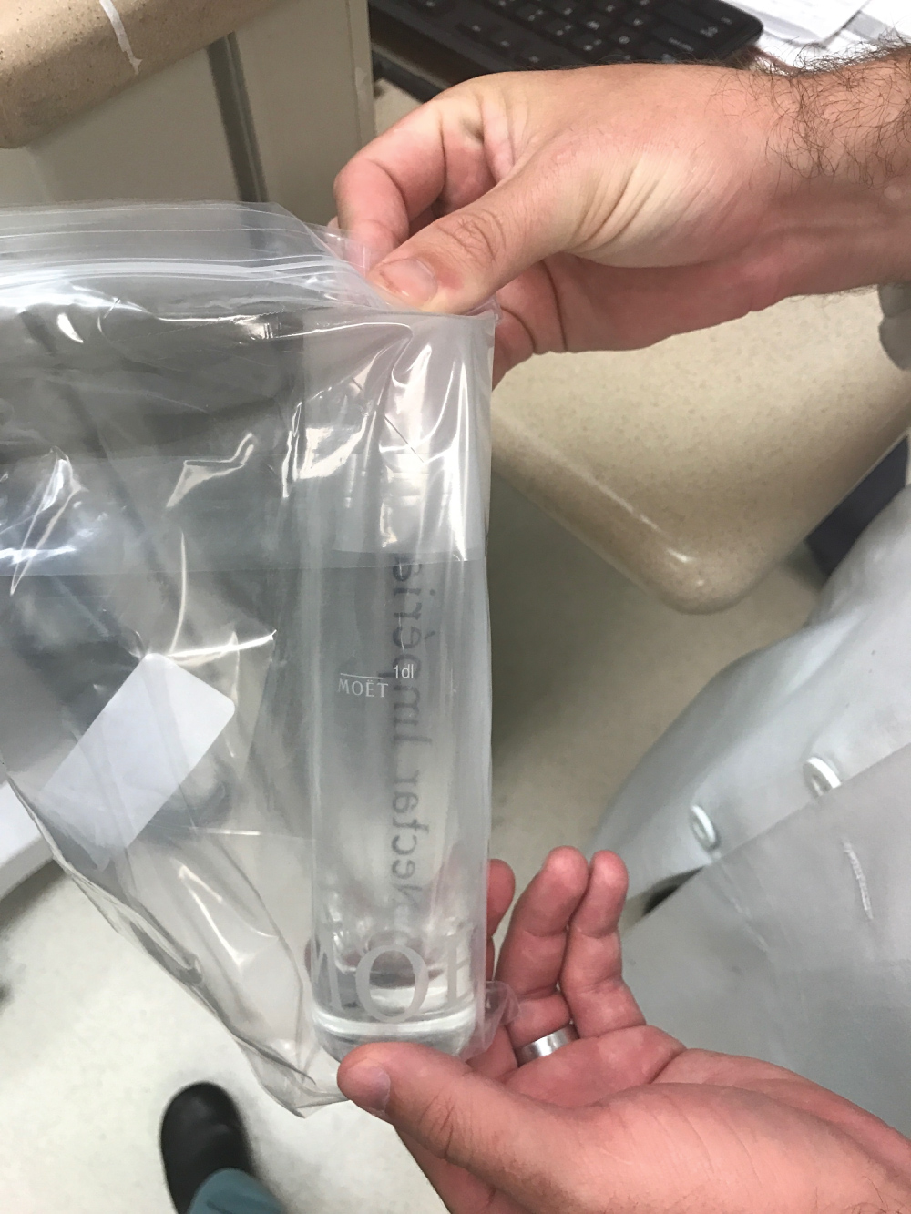 A 62-year-old man with no significant past medical history presented to the emergency department about one hour after insertion of a tall thin glass into his rectum. The patient attempted to remove the glass but the end of it broke off. With the onset of rectal pain and bleeding, he decided to go to the ER via EMS. The patient had normal vital signs on presentation. Digital rectal exam was not performed due to the presence of broken glass. External perianal exam was significant for blood at the anal verge. X-ray confirmed presence of the retained foreign body (Figure 1). The patient brought a matching glass, so that we could understand what the foreign body looked like (Figure 2). Due to the presence of rectal bleeding, we knew that there was high likelihood of rectal injury. The patient was brought to the operating room for anorectal exam under anesthesia with removal of the foreign body. He was placed in high lithotomy position in the candy cane stirrups. A Lone Star retractor was carefully placed to evert the anus. Fractured glass was visible in the anus pushing into the anal sphincter. The glass was thin and was pushing up against the wall of the anus/distal rectum circumferentially. A few pieces of glass broke off while attempting to place retractors around the foreign body. Ultimately the only retractor that we were able to successfully place between the glass and the rectum was a narrow malleable. Numerous malleable retractors were placed circumferentially around the foreign body to protect the anal canal from the sharp, jagged edge of the glass cup. We attempted to remove the glass with this technique; however the closed end of the glass was suctioned to the rectal wall proximally. We passed an Argyle suction catheter with a chimney valve past the glass into the rectal lumen and insufflated air above the glass which successfully released the suction. With this maneuver, we were able to shimmy the glass out using the circumferential malleable retractors. The glass measured 16 cm in length by 5 cm in width (Figure 3). There was 200 cc of blood in the rectum after the glass was removed. Transanal endoscopic microsurgery (TEMS) was performed to assess for rectal injury. A very patulous anus precluded the use of flexible sigmoidoscopy due to inadequate insufflation. TEMS revealed two 1 cm mucosal injuries in the distal third of the rectum which appeared superficial and required no intervention. There was a 2-3 centimeter left posterior quadrant anal sphincter injury involving the internal anal sphincter and a few fibers of the external anal sphincter. This was repaired with a running 2-0 Vicryl suture and the distal aspect was left open to allow for drainage. There was also an anal mucosal injury over a large hemorrhoid which was repaired with a Vicryl suture. Given that there was no frank full-thickness rectal injury, we elected not to perform a diverting stoma. Post-operatively, the patient did well. A CT scan of the pelvis was performed to evaluate for any glass fragments not previously identified during examination under anesthesia. This was negative for retained foreign body. The patient tolerated a diet and was discharged on post-operative day 0.