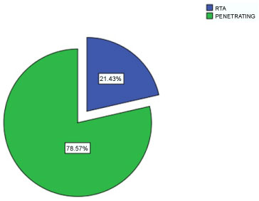 In our series twenty-eight patients with abdominal trauma, 22 penetrating trauma (78.57%) all were shotgun injuries, and 6 blunt trauma (21.43%). In penetrating trauma therapeutic laparoscopy for seven patients (31.8%), diagnostic laparoscopy for 10 patients (45.5%), and negative laparoscopy for 5 cases (22.7%). In blunt trauma therapeutic laparoscopy for 2 cases (33.3%), diagnostic laparoscopy for 3 cases (50%), and negative laparoscopy for 1 case (16.7%). The rate of conversion to laparotomies was 8 cases (28.5%) for both penetrating and blunt trauma.